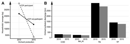 Moreover, the participant household decreased the chemical fertilizer and compound fertilizer amount. The COF project has demonstrated that it played a crucial role in alleviating water pollution in DHW. Figure 4A showed the changes in rural households’ average orchard yields in 2010 and 2015. Participants’ orchard average yields in each household in 2010 were 29,950.850 kg, and it sharply reduced to 3702.290 kg in 2015. However, the nonparticipants’ orchard yields were 21,976.760 kg in 2010 and 13,490.630 kg in 2015. The main rural non-point source pollution type is COD, NH3-H, TP, and TN. Figure 4B indicated orchard discharges of Chemical Oxygen Demand (COD), NH3-N, Total Nitrogen (TN), and Total Phosphorus (TP) in 2010 and 2015. The COF program has reduced COD, NH3-H, TN, and TP content by 32.650, 313.010, 138.230, 25.580 tons per y, respectively, and improved water quality since the program was initiated in 2010. The orchard area in DHW in 2010 and 2015 is 50,427 ha and 45,527 ha. The pollutant discharge of COD between them is 336.000 tons and 303.351 tons during the two periods, and the NH3-N between them are 263.200 tons and 237.625 tons, respectively. The TN and TP have shown a decreasing pattern in the two periods. We estimate that TN pollutant discharge decreased from 3221.300 tons to 2908.286 tons, and TP reduced from 1422.500 tons to 1284.275 tons. Therefore, this evidence clarifies that the COF program has effectively controlled the soil and water pollution in DHW.