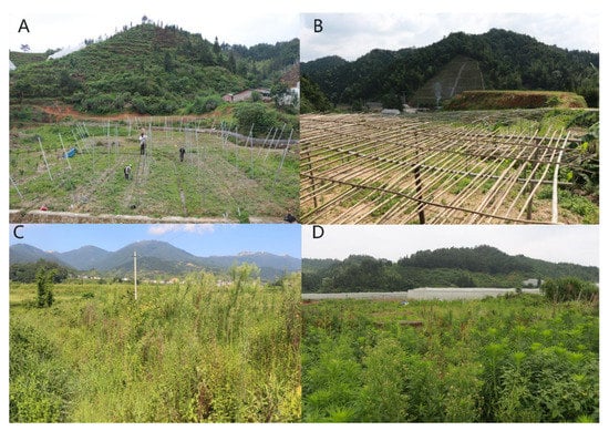 The typical landscape changes in the flat area due to the COF project. (A) The farmers start to plant the orchard tree in the flat area; (B) The farmers begin to cultivate the passion fruit; (C) The previous paddy field in the flat spot has become grass and shrub landscape; (D) The water conservancy facilities used to irrigate the rice filed has been abandoned and has not the function of cultivating rice.