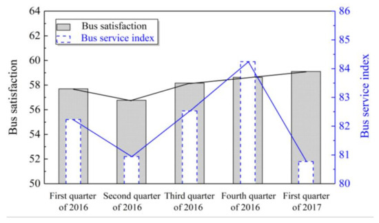 - In the first quarter of 2017, passengers’ satisfaction and bus service index showed an opposite trend. At that time, the bus service index showed an upward trend, while satisfaction showed a downward trend. Indicators examined by Shenzhen bus service index include the degree of congestion, waiting time of passengers, the travel speed of passengers, maintenance of station facilities, etc. It indicated that there may be some non-mentioned index factors, such as policies, management measures, or special events, which lead to satisfaction decline. Specific reasons are thought of in the following section.