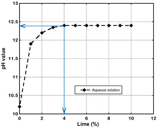 The OLC test was conducted by mixing 50 g of an oven-dried soil containing various percentages of lime (1~10%) with about 200 mL of distilled water to obtain an aqueous solution. The solution was stirred at regular intervals while the pH values were taken after 3 h. The plot of pH versus lime content determined at standard room temperature (25 ± 1 °C) is shown in Figure 1. It is evident from the plot that the OLC of the soil is 4%. Beyond this value, further increase in lime content did not cause any apparent increase in pH. Therefore, in view of the primary objective of this research, which was to evaluate the long-term stability of lime-stabilised lateritic soil under continuous water ingress, various quantities of lime were added to the lateritic soil in percentages that were below and above the soil’s OLC. Hence, the LLS samples were prepared by adding various quantities of lime in the range of 0, 2.5, 5, 7.5, 10, 15, and 20% by dry weight of soil. Each of the soil samples was manually mixed with distilled water to the desired compaction water content and left in an air-tight container for a minimum of 3 h to ensure uniform moisture distribution.