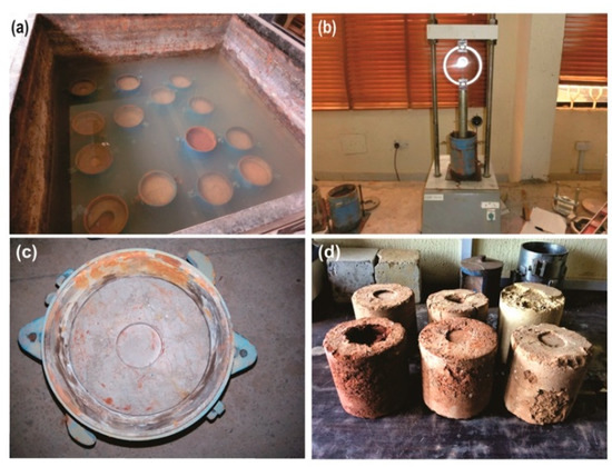 (a) Soaking of natural soil and lime-lateritic soil samples (b) Experimental device for determination of CBR values of natural soil and lime-lateritic soil samples (c) Standard mould used for the CBR test and (d) lime-lateritic soil samples extruded from the mould after CBR test.