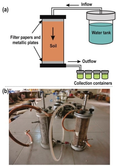 The effect of rainfall-induced water ingress on the physicochemical behaviour of the natural soil (control specimen) and the LLS samples was evaluated by carrying out column leaching experiments using two Perspex acrylic columns with an internal diameter of 7 cm and height of 25 cm. (Figure 3). The details of the experimental setup and testing conditions adopted for the leaching test coupled with the procedure for the physicochemical analysis have been extensively described by [57,72]. Percolation through the soil samples was simulated using a water tank containing distilled water. The water tank was set up such that it imposes a constant hydraulic head of 1 m, which corresponds to a hydraulic gradient of 4. The hydraulic gradient was applied to simulate flood inundation in seasonally flooded low-land areas [61,73]. Selection of the hydraulic head for the leaching experiments was done based on two conditions [63]. Firstly, the hydraulic head must be at a critical value to ensure adequate interaction between the leaching fluid and the soil. This condition was achieved by applying no confining pressure on the leaching fluid, in contrast to the methods adopted by several authors [52,53,60,61,63], who imposed confining pressure values that varied from 20 to 120 kPa. Secondly, the hydraulic head must be high enough to allow significant volume of leachate to be collected at appropriate intervals. Preventive measures, such as covering the upper and lower parts of the soil sample with a filter paper and wire mesh, were taken to minimise the erosion of fines into the leachate. The leachate was collected at regular intervals and stored in pre-washed and properly labelled 0.5 L PET bottles.