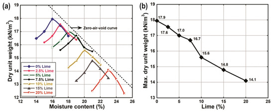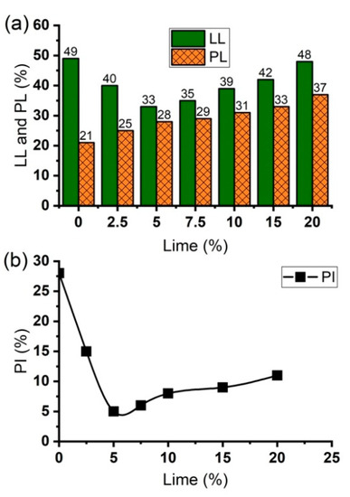The effect of lime on the Atterberg limits (liquid limit, plastic limit, and plasticity index) of the soil is shown in Figure 4. The result indicates that the plastic limit (PL) of the soil generally increased with an increase in lime content. In contrast, there was an initial reduction in the liquid limit (LL) and plasticity index (PI) of the soil as lime content increased from 0% to 5% (Figure 4a). This sudden decrease in LL and PI of the soil is closely connected to the relatively high amount of ions in the pore fluid, which results in a decrease in the DDL thickness, and hence causes a decrease in the liquid limit of the soil [68]. However, further addition of lime beyond 5% caused an adverse effect on the soil as evidenced by the gradual increase in LL and PI of the soil (Figure 4b). The trends in LL and PI are typical characteristics that distinguish silica-rich lateritic soils from other problem soils [39]. Hence for silica-rich residual soils, further increase in liquid limit is usually triggered by the enhancement of the cation exchange capacity, due to the highly alkaline environment produced by the dissolution of , which increases the pH of the pore fluid [74]. Furthermore, Diamond and Dash, [37,39] observed that the flocculent nature of the soil fabric is an essential factor controlling its liquid limit. The more flocculated the soil structure is, the higher the water-holding capacity of the soil, and thus the higher the liquid limit. Similar trend in PI was observed by [27], who investigated the effect of quicklime on the geotechnical properties of lateritic gravel from Burkina Faso. The authors reported that PI decreased from 10.5% of the natural soil to 8.5% when treated with 3 wt.% lime. However, treating the soil with 8 wt.% lime caused the PI to increase to 11.8%.