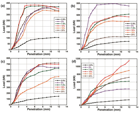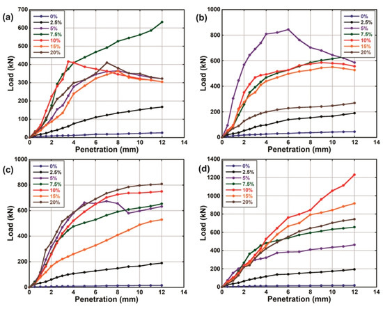 Pre-leaching load-penetration curves of natural soil and lime-lateritic soil samples after a soaking period of (a) 3 (b) 7 (c) 14 and (d) 28 days.