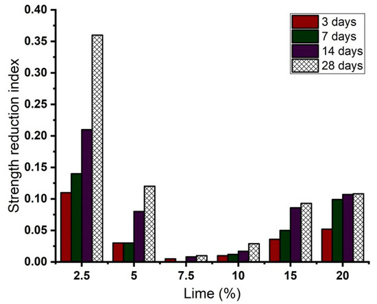 Figure 9 shows the strength reduction indices (SRI) of the LLS samples determined from the pre-leaching and post-leaching CBR values of the natural soil and the LLS samples. The SRI values of the LLS samples at different lime contents and leaching periods were determined as per the equation below: