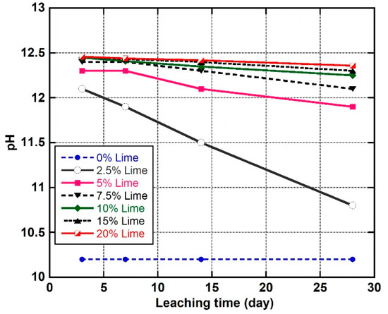 Figure 10 shows the variation of pH of the leachate obtained from the natural soil and the LLS samples at different leaching periods. The trend of the result indicates that the pH of the natural soil was constant at 10.2 as the leaching time progressed from three to 28 days. The addition of various percentages of lime to the natural soil and leaching for a minimum of three days caused the pH of the lateritic soil to increase from 10.2 to 12.1 and 12.46, which corresponds to the LLS samples treated with 2.5 and 20 wt.% lime, respectively. Furthermore, the results show a marked decrease in pH values of the LLS samples as the leaching time increased from 3 to 28 days. The rate of reduction in pH of the treated soil samples was found to decrease with an increase in lime content. The highest percentage decrease in pH (10.7%) after a leaching period of 28 days was observed in the LLS sample treated with 2.5 wt.% lime, whereas the percentage decrease in pH of the soil LLS samples treated with 5, 7.5, 10, 15, and 20 wt.% lime was 3.3%, 2.4%, 1.6%, 1.3%, and 0.8%, respectively. Furthermore, the pH values of the treated soil samples were above 12 after a leaching period of 28 days, except for the LLS samples treated with 2.5 and 5 wt.% lime, which had pH values of 10.8 and 11.9, respectively, for the same leaching period. The gradual decrease in pH of the pore fluid was due to the leaching of and ions from the soils, which causes a reduction in the pozzolanic activity. Some researchers (e.g., [40,68]) have attributed the highly alkaline nature of the pore fluid to the dissolution of and ions as a result of mixing the soil with CaO in the presence of water. However, the decrease in pH of the pore fluid has been ascribed to: (1) the pozzolanic reactions that result in the depletion of soluble calcium concentration, especially at lime contents below the OLC of the soil [33,82], and (2) the removal of lime from the LLS samples under continuous leaching [60]. Similar trends in pH reduction under continuous curing and leaching have been reported by [34,61,83].
