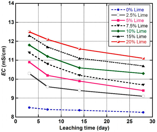Figure 11 shows the variation of EC of the pore fluid as leaching time increased from three to 28 days. According to [33], electrical conductivity (EC) is a physicochemical parameter that can be used to determine the conductivity of solutions and thus is a function of the amount of ions (cations or anions) in the solution. The addition of various amounts of lime to the natural soil and leaching for a minimum of 72 h (three days) caused the EC value to increase from 8.5 to 10.3, 11.4, and 12.5 mS/cm, for the LLS samples treated with 2.5, 7.5, and 20 wt.% lime, respectively. The marked increase in EC values of the stabilised soil samples signifies the dissolution of to release calcium and hydroxyl ions [33]. Beyond the 3 days leaching period, the EC values of the stabilised soils decreased considerably as leaching time increased from 7 to 28 days. The low (terminal) EC value of the LLS sample treated with 2.5 wt.% lime, relative to the LLS samples treated with higher percentages of lime (5, 7.5, 10, 15, and 20 wt.% lime), could be ascribed to (1) the fact that the amount of lime added to the natural soil was significantly below the soil’s OLC. Consequently, the concentration of ions in the pore fluid of the soil was significantly insufficient to ensure complete flocculation and agglomeration of the clay fraction in addition to ensuring long-term pozzolanic activity; and (2) the considerable depletion of calcium ions from the pore fluid as a result of continuous leaching. The results further indicate that the EC value of the natural soil slightly decreased from 8.5 to 8.25 mS/cm, while the EC values of the LLS samples increased with an increase in lime but generally decreased as the leaching time increased from three to 28 days. Similar trends in EC values have been observed by [33,34,84].