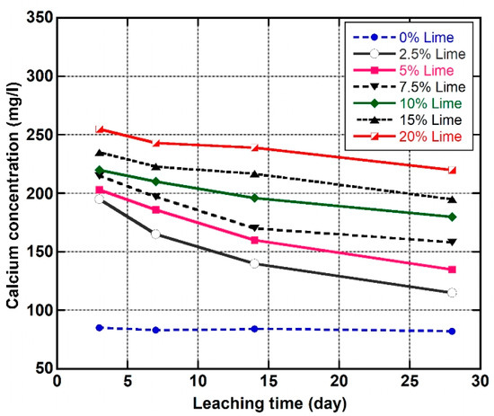 The trends of calcium concentrations in the leachate of the natural soil and the LLS samples are given in Figure 12. The results reveal a general decrease in calcium concentration in all the leachate, except for the natural soil, where the concentration of calcium varied from 82 to 85 mg/L. Furthermore, the concentrations of calcium in the leachate can be seen to increase with an increase in percentage lime content. The soil specimens treated with 2.5, 5, and 7.5 wt.% lime had the lowest concentrations of calcium in their leachate (195, 203, and 215 mg/L), which decreased to 115, 135, and 158 mg/L, as the leaching time progressed from three to 28 days. In contrast, the initial concentration of calcium in the leachate of the soil mixtures treated with 15 and 20 wt.% lime decreased from 235 and 255 mg/L to 195 and 220 mg/L under the same leaching period. It is important to note that the highest and lowest rates of calcium washout were observed in the LLS samples treated with 2.5 and 20 wt.% lime, which gave a percentage decrease of 41% and 13%, respectively. This behaviour has been found to occur in soil mixtures dosed with lime at or below the OLC of the natural soil and has been ascribed to the immediate consumption of calcium, given the very low alkaline nature of their pore fluid, which is responsible for enhancing cation exchange and pozzolanic reactions [85]. Conversely, the high amount of ions in the pore fluid of the LLS samples stabilised above the OLC of the lateritic soil is responsible for long-term cation exchange and pozzolanic reactions which produce hydrated cementitious products that cause considerable improvements in strength, stiffness, and durability of the stabilised soil samples.