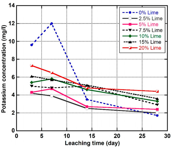 Figure 13 shows the variation of potassium () concentrations in the leachate of the natural soil and the LLS samples. The results reveal that the concentration of ions in the leachate of the LLS samples increased with an increase in lime but decreased as the leaching time progressed from three to 28 days. However, the concentration of ions in the leachate of the natural soil increased from 9.6 to 12 mg/L and subsequently decreased sharply to 1.7 mg/L, as the leaching time progressed from three to 28 days. The high concentration of ions in the leachate of the LLS samples stabilised above the OLC of the lateritic soil is attributed to the highly alkaline environment produced by the dissolution of ions; this intensified the dissolution of the siliceous and aluminous compounds from the lattices of the clay minerals to release ions and other ions such as , , and . These ions then react with cations from the lime to form cementitious products responsible for long-term strength improvements in the LLS soils following the reaction mechanisms as represented by Equations (2)–(5).