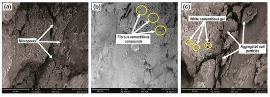 Scanning electron microscope images of (a) natural soil, (b) LLS + 5 wt.% lime, and (c) LLS + 15 wt.% lime after a soaking period of 28 days.
