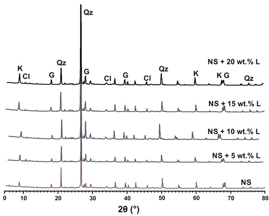 X-ray diffractograms of natural soil and lime-lateritic soil samples admixed with 5, 10, 15, and 20 wt.% lime after a leaching period of 3 days. (NS = natural soil, L = lime, Cl = chlorite, G = goethite, K = kaolinite, Qz = quartz).