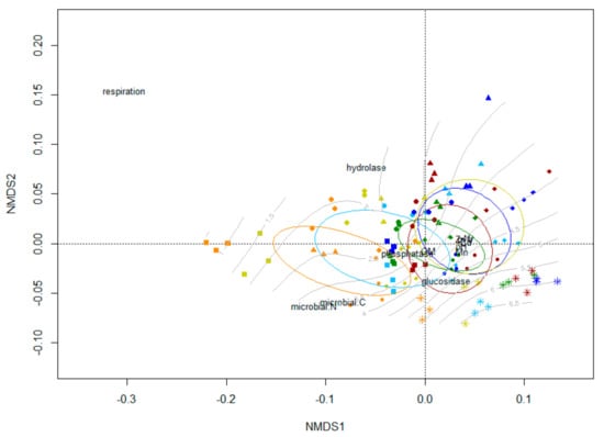 The MANOVA highlighted significant differences among the treatments (F = 3.77, p < 0.001) and sampling times (F = 32.55, p < 0.001). The NMDS with the superimposition of confidence ellipses (Figure 1) clearly separated CMP and partly C + M treatments from the others (FNG, F + M, MIN and UNT), with soil respiration, hydrolase activity, and microbial C and N relatively more abundant in mesocosms amended with BC. The same parameters were more abundant in the first months of incubation.