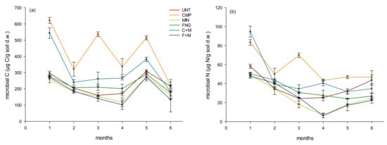 Mean values of (a) microbial C and (b) microbial N in untreated soil (UNT), and in soils treated with biowaste compost (CMP), sewage sludge (FNG), compost plus mineral fertilizer (C + M), sewage sludge plus mineral fertilizer (F + M) and mineral fertilizer (MIN) during 6 months of incubation. The error bars represent the standard deviations.