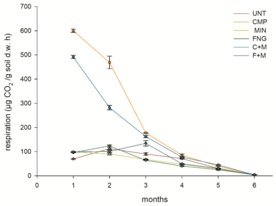 Mean values of soil respiration in untreated soil (UNT), and in soils treated with biowaste compost (CMP), sewage sludge (FNG), compost plus mineral fertilizer (C + M), sewage sludge plus mineral fertilizer (F + M) and mineral fertilizer (MIN) during 6 months of incubation. The error bars represent the standard deviations.