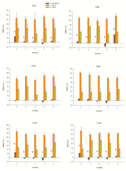 Results from toxicity testing and relevant statistics were summarized in Figure 6 for R. subcapitata, L. sativum and D. magna. During the experimental period, the toxicity results for all testing species did not significantly change except for R. subcapitata (i.e., CNT, CMP, C + M, and F + M). The germination index values from L. sativum always ranged for all treatment conditions between 80% and 120%, suggesting that neither inhibition nor biostimulation effects occurred [43]. The immobilization effect values from D. magna were not significantly different (for α = 0.05) from CNT (reference soil); all treatments, and time (i.e., from treatment administration) ranging between 35% and 75% of effect. Microalgae evidenced in CNT, C + M, and F + M a decrease of toxicity from month 2 to 6, keeping not significantly different toxicity values from month 3 to month 6 (effect < 10%). Conversely, R. subcapitata evidenced in CMP an increase of toxicity from month 5 to 6, keeping not significantly different toxicity values from month 2 to month 5 (effect < 10%).
