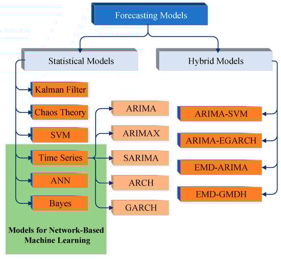 In the past few years, various machine learning methods have been proposed in big data analysis, especially some network-based methods. Researches have focused on neural networks [27,28], Bayesian networks [17], and time series. The purpose is to take advantage of the correlations that exist between the data and process this at different time intervals and on different links of the network. This paper makes predictions from the cyclical aspect, where time series have advantages. From the perspective of the basic structure of traffic flow (cyclical trend), the popular and universal view in traffic flow theory is that traffic is mainly cyclical, and the cycle exists within the day and week. Although the frequency domain method reveals the characteristics of periodic traffic flow that changes with time and claims to effectively capture intra-day cycles [29], due to the importance of the correlation of traffic data at different times, the traffic flow prediction methods present in the literature are mainly focused on the time domain method, which regards the current value of traffic flow as its past value. Among the time domain methods, the autoregressive integrated moving average (ARIMA) model is one of the most widely used regression techniques. The research on the recent hybrid model related to time series is as follows: Song et al. applied the ARIMA-SVM model to predict the daily mean value of PM 2.5 concentration in Shenyang [30]. Sharma and Ghosh used the ARIMA-EGARCH model to make short-term predictions of wind speed variation in Maharashtra, India [31]. To predict the volatility of the securities market, EGARCH-ANN was adopted [32]. These studies show that hybrid models can improve the accuracy of traffic prediction by decomposing traffic data into different components. Although the prediction results of the hybrid prediction model reveal certain advantages compared with the traditional method, there may be overfitting problems. To address this issue, Shabri used multiple prediction techniques (ARIMA, group method of data handling (GMDH)) combined with empirical modal decomposition (EMD) to predict the number of tourists traveling to Malaysia from Singapore [33]. The results indicate that using EMD to decompose the prediction data in advance will help prevent overfitting. Wang et al. combined EMD and the ARIMA model (EMD-ARIMA) to predict the short-term traffic speed of expressways [34]. The hybrid model showed better prediction accuracy than the traditional ARIMA method. The above research results combining EMD and the ARIMA model to predict peak anomalies show that the main advantage of this model is to correct individual defects. It produces synergistic effects in short-term predictions such as traffic speed and passenger flow and can handle non-linear and non-stationary sequences. In view of the current research, this paper summarizes the mentioned forecasting models in Figure 1.