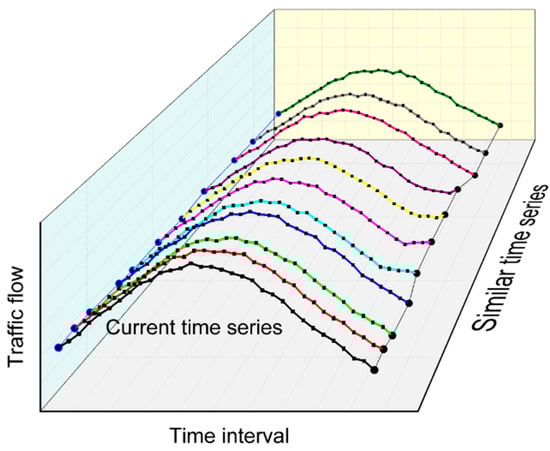 Although many methods that improve prediction accuracy have been proposed, short-term traffic flow prediction remains a difficult challenge. Most of the research results focus on the optimization of the model, while ignoring the effective use of the similarity features of the traffic flow data. Specifically, most prediction models take all traffic flow data before the predicted time as input data. However, fluctuations in traffic flow are highly random. Prediction bias will occur if the input data of the prediction model only depends on the data of the previous moment. Yang et al. believe that the establishment of a multi-step prediction method that can fully utilize the similarity characteristics of traffic flow time series will significantly improve efficiency and accuracy [37]. Given this problem, this study presets categorical variables for dates when calibrating time series of data, then training similar time series during modeling. Cools et al. conducted a simulation analysis of Sunday′s explanatory variable (called intervention in time-series terminology) when discussing the Sunday effect, and achieved good results [7]. Analyzing the data of this study, we can find that the traffic volume of the Jiangsu expressway network fluctuated around the weekend. This paper classifies variables on Friday, Saturday, and Sunday, because it is found that there is an abnormal peak in passenger traffic on a certain number of urban origin-destination (OD) pairs in the training data; that is, Friday, Saturday, and Sunday all show unique time-series characteristics. Figure 2 is a schematic diagram of similar time series.