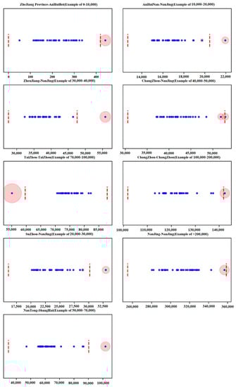 Before identifying anomalous peak values of traffic volume on the road network, this study must first define the criteria of the anomalous peak value. To examine the rationality of the classification criteria of the anomalous peak value, the OD pairs between cities are divided into nine levels according to the amount of traffic volume: 0–10,000 pcu/D, 10,000–20,000 pcu/D, 20,000–30,000 pcu/D, 30,000–40,000 pcu/D, 40,000–50,000 pcu/D, 50,000–70,000 pcu/D, 70,000–100,000 pcu/D, 100,000–200,000 pcu/D, and >200,000 pcu/D (where pcu/D means passenger car units per day) On this basis, the traffic volume distribution of selected urban OD pairs is analyzed and verified at each level. The Pauta criterion, based on statistical rule, and the classic local outlier factor (LOF) algorithm, based on density, have been introduced in Section 2. The following is a visual analysis of the above two methods based on real data, as shown in Figure 3.