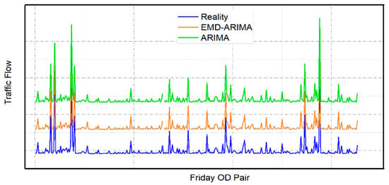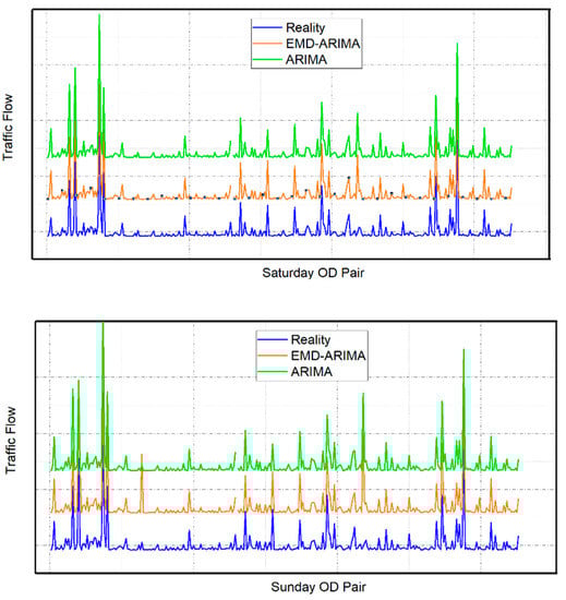 Thirdly, on the indicator of VAPE, the EMD-ARIMA model is better than the ARIMA model on Friday, while the ARIMA model is better than the EMD-ARIMA model on Saturday and Sunday. This result may be due to the huge difference of fluctuations in passenger traffic between the OD pairs in each city, which makes obvious fluctuations in the difference between the OD pairs and the mean error, resulting in fluctuations in the indicators of the EMD-ARIMA model and the ARIMA model.