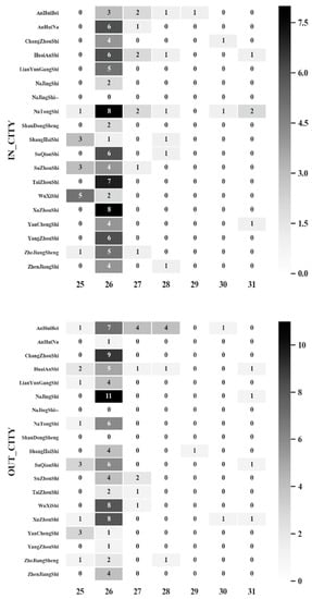 The anomalous peak values of traffic volume are screened from the results predicted in Section 4.2 according to the Pauta criterion verified in Section 4.1. There are 326 OD pairs between cities in total, and the results are summarized in Figure 5 according to the difference of origin and destination. The dates 25th and 26th are the weekend and the dates 27th to 31st are Monday to Friday.