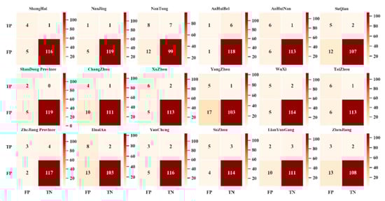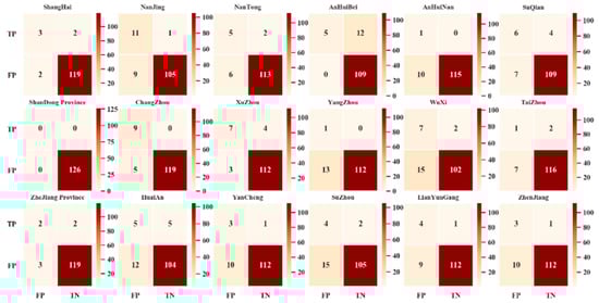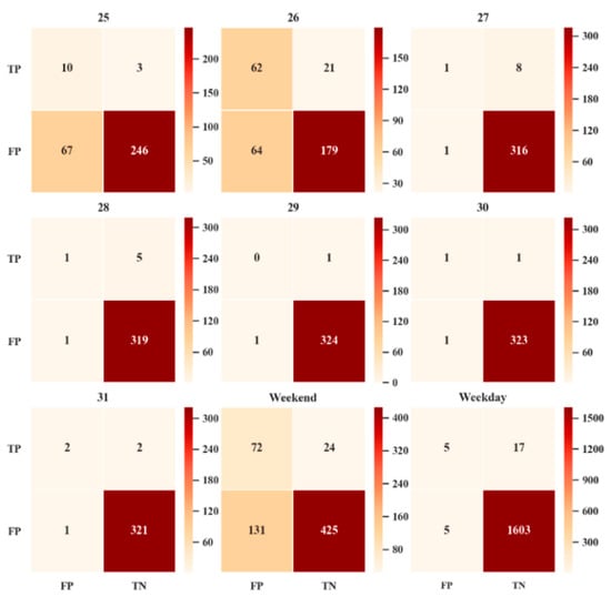 The correct prediction results, eliminating the true errors and retaining the false errors, are analyzed statistically. It is not difficult to see in Figure 5 that most of the peaks of traffic volume occur on the weekend, especially the absolute peaks on Sunday. However, there are no absolute peaks on Friday and so the weekend effect should be analyzed, as shown in Figure 6 and Table 2. In binary classification, the model prediction results mainly have the following four cases: TP (true and positive), FN (false and negative), FP (false and positive), and TN (true and negative). The meaning of relations to our study is TP (the actual traffic volume is the anomalous peak value and it is successfully identified), FN (the actual traffic volume is the anomalous peak value, but it is not successfully identified), FP (the actual traffic volume is normal, but it is identified as anomalous peak value by mistake), and TN (the actual traffic volume is normal and it is identified as normal). The color depth represents the number of times a logical judgment occurs.