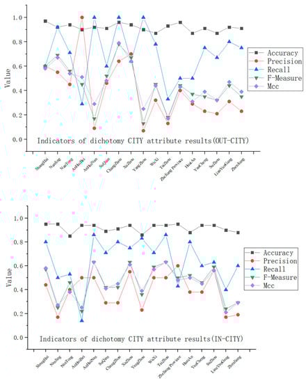 Indicators of dichotomy CITY attribute results (OUT-CITY upper/IN-CITY lower) (unit: times).