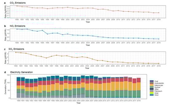 According to the State Energy Data System (SEDS), the change in the emission values that belong to the power sector is given in Figure 2 []. A closer look at the numbers shows that the CO2 emission level in 1990 was 69.09 Mton CO2 and decreased to 27.94 Mton CO2 in 2018. From 1990 through 2018, NOx emissions declined by 84%. The most significant improvement was seen in SO2 emissions by 96% from 459.77 kt in 1990 [].