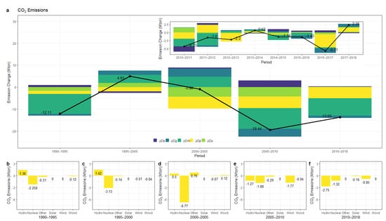 (a) Results of decomposition analysis for CO2 emissions from 1990 to 2018. Emission changes due to non-fossil-based resources for the period between (b) 1990–1995, (c) 1995–2000, (d) 2000–2005, (e) 2005–2010, (f) 2010–2018.