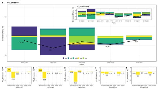 (a) Results of decomposition analysis for NOx emissions from 1990 to 2018. Emission changes due to non-fossil-based resources for the period between (b) 1990–1995, (c) 1995–2000, (d) 2000–2005, (e) 2005–2010, (f) 2010–2018.