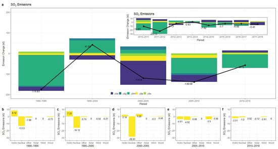 (a) Results of decomposition analysis for SO2 emissions from 1990 to 2018. Emission changes due to non-fossil-based resources for the period between (b) 1990–1995, (c) 1995–2000, (d) 2000–2005, (e) 2005–2010, (f) 2010–2018.