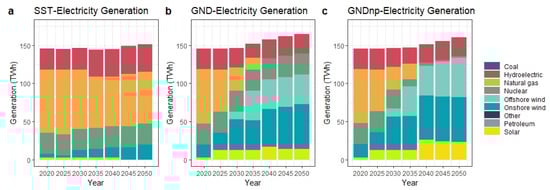 Different scenarios result in different electricity generation mix choices. The implications of the assumptions in the reference case and Green New Deal scenarios can be observed through changes in the generation. Figure 5 shows that in the SST, within renewable sources, the highest utilization belongs to hydropower, whereas the contribution of other renewable sources especially solar remains low in the long run compared to other scenarios. Besides hydropower, nuclear power is also popular as a cost-effective source of electricity generation. The use of natural gas is dominating the primary energy supply for electricity generation in the SST scenario, whereas in both alternative policy scenarios, we see a decline in natural gas consumption due to the renewable portfolio share target. In GND and GNDnp scenarios, electricity generation from natural gas is expected to hit zero by 2040, enforced by the “zero emission” target. Figure 5 also indicates the considerable reduction in natural gas use in GND and GNDnp even in the 2025–2040 period compared to the BAU.