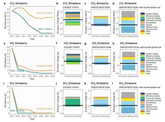 The impact of the associated technological choices and the accompanying supply mix of the scenarios on CO2, NOx, and SO2 emission levels are depicted in Figure 6. In the SST scenario, New York State’s power sector emissions are expected to reach 22.9 Mton CO2, whereas, in the GND and GNDnp scenarios, the CO2 emission levels follow a decreasing trend since we impose a constraint that ensures carbon neutrality by 2040. In SST, although the absolute value of the electricity generation from hydropower and nuclear does not fluctuate significantly, the share of electricity generated from those sources is expected to drop (for hydropower, from 19% to 14% and for nuclear generation from 32% to 22%). Hence, we observe an increase in emissions as given in Figure 6b, f, and j. The emissions have been expressed as the respective factor contributions to the total emissions. For SST, fossil fuel mix change and the electricity generated from wind provides the highest contributions to emissions reduction.