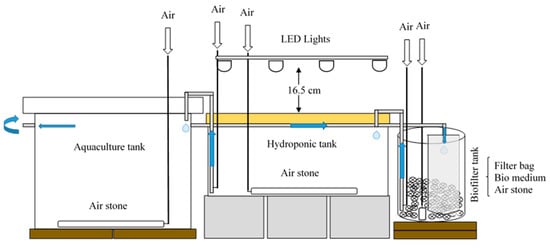 Aquaponics is a new, rapidly emerging, eco-friendly food production system (FPS) that links recirculating aquaculture systems (RASs) with hydroponics (plant production in water, without soil) []. This system combines the merits of both aquaculture and hydroponics, such as reduction in water usage, increased food production per unit area, reuse of wastewater and eliminating environmental pollution [,,]. Given these merits, aquaponics has been viewed as a promising approach for sustainable food production in the future. However, high electricity demand is a drawback of aquaponic systems []. To overcome this shortcoming, airlift, a technology that raises liquids by the pressure of air, is a more electrically efficient and alternative approach to promoting water flow and reducing electricity consumption from water pumps []. Moreover, this technology can be beneficial to areas with less power supply. Therefore, the technology was applied to the system design of the present study.