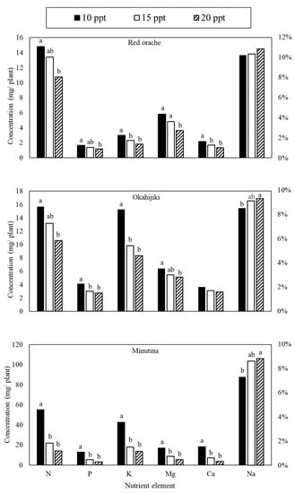 Values of final fresh weight, RGR, and water content of red orache cultivated in 10 ppt treatment were significantly higher (31%, 6%, and 1%, respectively; p < 0.05) than in 20 ppt, yet the results were not significantly different (p > 0.05) from 15 ppt regarding final fresh weight and RGR. In the aspect of water content, the highest value (90.7%) was shown in 10 ppt treatment and was significantly higher (p < 0.05) than the other two treatments. Although there was no significant difference (p > 0.05) among all treatments in dry weight and yield, the results followed the same trend as other parameters as well (Table 2). The concentrations of K and Ca were significantly higher (p < 0.05) in plants cultivated in 10 ppt treatment than 15 and 20 ppt treatments. N, P, and Mg were more concentrated in the 10 ppt treatment and were significantly higher than the 20 ppt treatment, yet were not significantly different from the 15 ppt treatment (Figure 2).