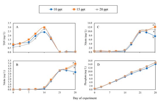 The weekly changes in TAN, nitrite-N, nitrate-N, and phosphate concentrations are shown in Figure 3. TAN, NO2−, NO3−, and PO43− displayed similar trends among the three treatments. The concentration of TAN in every treatment continued to increase in the first two weeks, then started to decrease and remained below 1 mg/L until the end of the experiment (Figure 3A). There were no significant differences (p > 0.05) among treatments. On the contrary, NO2− and NO3− stayed at low concentrations in the first two weeks and started to increase, yet the concentration remained at acceptable levels for shrimp and plants. At the end of the experiment, the concentrations of nitrite and nitrate in the 10 ppt treatment were significant lower (p < 0.05) than the other treatments (Figure 3B,C). The concentration of phosphate continued increasing throughout the experiment. Although the concentration in the 10 ppt treatment was slightly lower than the other treatments, there were no significant differences (p > 0.05) among treatments (Figure 3D).