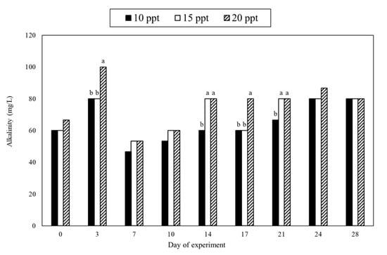 Salinity is another factor that affects the relative proportions of NH3 and NH4+ in the water []. The concentration of NH3 increases with higher temperature and pH, and lower salinity. In the present study, the amount of NH3 in the water only accounts for 2 to 3% of total ammonia nitrogen, which means NH4+ was the main source of nitrogen in the water. The lower alkalinity in the 10 ppt treatment may be because NH4+ serves as the main source of nitrogen for algae, and the biosynthesis of algae results in the consumption of alkalinity (as CaCO3) []. In addition, 3.57 g of alkalinity is consumed when heterotrophic bacteria convert a gram of NH4+ into microbial biomass. Heterotrophic bacteria were added into systems regularly in the present study; therefore, the alkalinity in the 10 ppt treatment was not only affected by the assimilation of heterotrophic bacteria, but also the biosynthesis of algae. This explains why the concentration of alkalinity in the 10 ppt treatment remained lower than that in 15 and 20 ppt treatment (Figure 4).