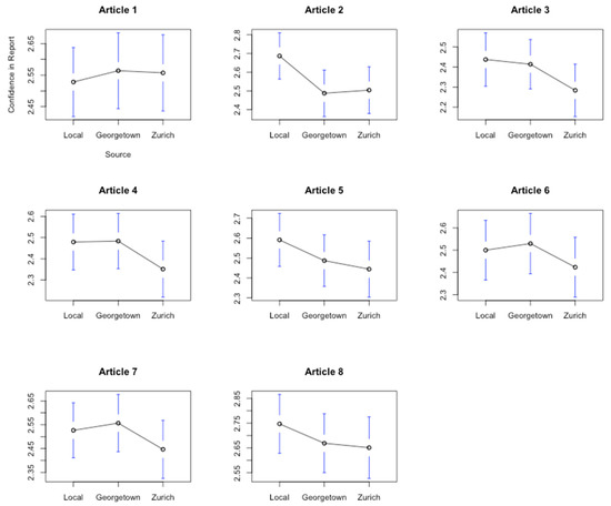 To test our first hypothesis, we performed a series of simple difference of means tests. Figure 1 graphically presents our results. The figures display average scores for respondents for each source, with vertical lines indicating the 95% confidence interval around that average. We see that the relationship between confidence in the report and the source varies by article. Some showed the expected pattern with the local university as most credible, and others showed the opposite pattern. Overall, none of the differences among sources in confidence in the report were statistically significant at p < 05. Hypothesis 1 must therefore be rejected. One may think that this null finding can be explained by Democrats and Republicans responding differently to the treatment; however, within a regression framework with controls for party affiliation, ideology, education, and income, confidence in the report is not moderated by party affiliation although Republicans were more skeptical of the report (results not shown).