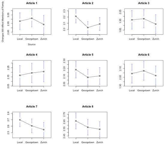 We repeated the analysis for each of the three questions about the impact of climate change on the respondent, members of the respondent’s family, and society in general. Figure 2 presents the results for whether the climate changes described would affect the respondent’s family. The results are effectively the same. The differences among the sources are not statistically significant at p < 0.05. Hypothesis 2 is not supported by the data. We obtained the same result for impacts on the respondent and society. The data are not shown. Using multiple regression with control variables, party affiliation did not moderate the effect of the source of the report for the belief that climate change will impact the respondent’s family (results not shown).