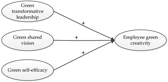 Green shared vision refers to a collective vision of environmental goals that are internalized in an organization [41]. Researchers have revealed that a shared vision helps employees form a common insight and objective in an organization [42]. In support of a shared vision in an organization, employees can fluently identify, absorb, and recombine different ideas, knowledge, skills, and technologies to further enhance creativity [43]. Moreover, a common organizational strategy provided by a shared vision motivates employees to work toward organizational goals, such that it enables them to be more creative [12]. In the environmental era, to meet global green needs, green shared vision is important for green creativity. Through empirical analysis, Chen et al. demonstrate the positive effect of green shared vision on green creativity [4]. Therefore, we propose the following hypothesis: