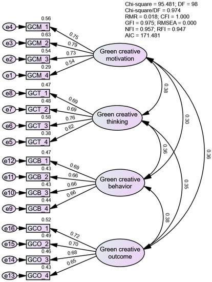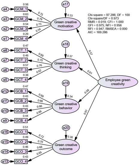 To check the validity of the four-dimensional structure model of employee green creativity, we used IBM SPSS AMOS 22 (SPSS Inc., Chicago, IL, USA) to conduct confirmatory factor analysis (CFA). Initially, we established a four-factor model based on our conceptualization of employee green creativity. Specifically, four latent variables were created: green creative motivation (4 items), green creative thinking (4 items), green creative behavior (4 items), and green creative outcome (4 items).