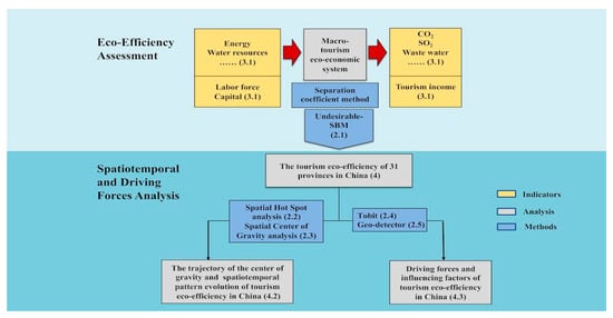 Energy and water resources were selected as input indicators for the eco-environment, while SO2, wastewater, domestic waste, and carbon emissions were selected as undesirable output indicators. Eco-environment indicators were then treated using the tourism separation coefficient method. Thus, constructing an undesirable-SBM model, we were able to evaluate the tourism eco-efficiency of 31 provinces in China. We used Spatial Hot Spot and Spatial Gravity Center analyses to assess the moving track, spatiotemporal evolutionary patterns, and spatial agglomeration characteristics of tourism eco-efficiency. The Panel Tobit Regression Model was then used to identify the spatial differentiation of regional tourism eco-efficiency’s internal driving forces. This enabled us to reveal the main driving factors for improving the internal operating efficiency of the tourism eco-economics system. Thus, the external influencing factors of regional tourism eco-economics were identified as Geodetector.