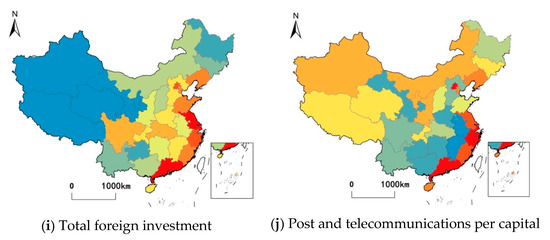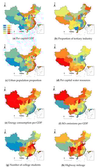 The level of economic development is mainly expressed in terms of per capita GDP (yuan), the degree of industrial structure optimization is mainly expressed by the proportion of tertiary industry (%), the level of urbanization is expressed by the proportion of the urban population (%), the level of natural resources is expressed based on per capita water resources (tons), the level of low-carbon production is expressed via energy consumption per unit GDP, and the level of environmental protection is expressed based on SO2 emissions per unit GDP. Similarly, the degree of social civilization is expressed via the number of students in ordinary colleges and universities (unit: 10,000), traffic conditions are expressed via highway mileage (unit: 10,000 km), degree of opening up is expressed via the total amount of foreign-invested enterprise at year-end (unit: million US dollars), and the level of scientific and technological development is expressed via the total amount of postal and telecommunications business per capital (yuan). The per capita GDP, energy consumption per unit GDP, SO2 emissions per unit GDP, and total post and telecommunications business per capital were disposed of by constant consumer price index based on 1997 values. The regional tourism eco-efficiency was analyzed using a level lattice, and the factors were divided into ten classes using the natural breakpoint method. Take 2016 as an example—shown in Figure 2.