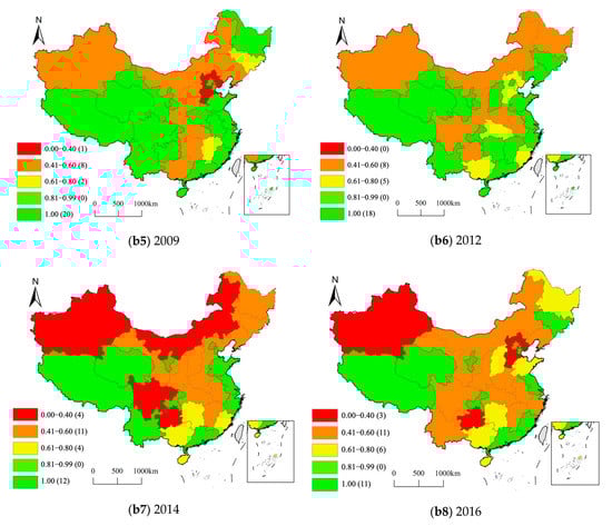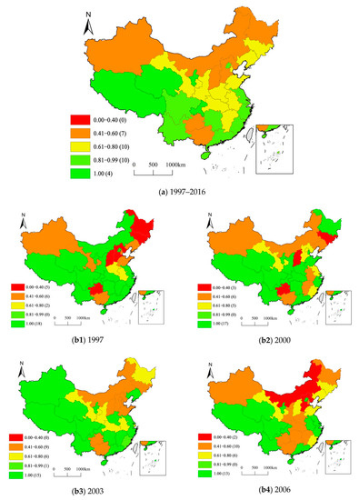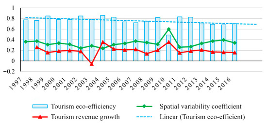 We calculated the tourism eco-efficiency of 31 provinces in China in the period 1997–2016 using undesirable-SBM. Results show in the last 20 years, the tourism eco-efficiency in China has decreased. (Figure 3) The spatial variation coefficient was about 0.4, remaining relatively stable, while the spatial difference in 2010 revealed a significantly higher trend. This means that the 2008 Olympic Games also impacted the spatial differentiation of regional tourism eco-efficiency. Indeed, in the last 20 years, as a new growth pole to stimulate the economy and expand domestic demand, tourism has attained a rapid development with a growth rate of about 20%. However, tourism eco-efficiency has tended to follow a general downward trend. This shows that the input–output efficiency of the tourism eco-economic system is decreasing, and environment and ecology elements are not reasonably allocated. The rapid economic growth led to a worse impact on the eco-environment. Moreover, the influence on the eco-environment has intensified annually, leading to a declining trend in eco-efficiency.