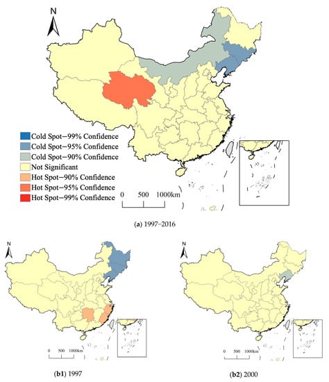 We have introduced the Gi* index to analyze spatial patterns in tourism eco-efficiency. Thus, based on the analysis of the average tourism eco-efficiency level from 1997 to 2016, the Gi* index results are divided into seven categories according to the significant level of spatial positive and negative correlation. These include three kinds of cold spot regions with negative correlation significance of 0.01, 0.05, and 0.1, the region with insignificant correlation, and the hot spot regions with positive correlation significance of 0.01, 0.05, and 0.1, respectively.