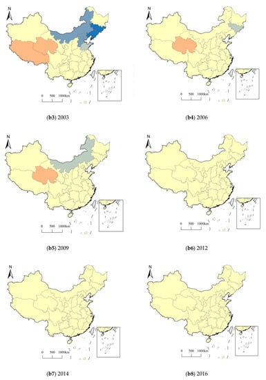 High eco-efficiency regions for tourism are generally distributed in regions with good eco-environmental backgrounds or high levels of economic development. (Figure 4) From 1997 to 2016, provinces with higher tourism eco-efficiency values appeared in the western regions where the eco-environment background is better, and in the southeastern coastal area where the economic developmental level is higher. Qinghai, Tibet, Ningxia, and Chongqing were the highest efficiency areas in the last 20 years, while Beijing, Shanghai, Guangdong, and some southeastern coastal areas also have certain advantages with relatively high efficiency, and Sichuan and Yunnan were advantageous regions for tourism development, as their eco-efficiency were relatively high. The remaining areas occur in low eco-efficiency regions. Overall, the spatial tourism eco-efficiency conforms to a high-efficiency belt in some western and southeastern coastal regions, a medium efficiency belt in central and western regions, and a low-efficiency zone in northern China.