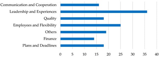 Project managers are vital players in achieving project success [133]. Kerzner [134] recommended using management techniques and practices for successful project management. The process of project implementation similar in all projects, although each project is different and unique [135]. According to Dissanayake and Kumaraswamy [135], a good relationship between the construction company and a representative of the client accelerates traffic and helps achieve success. The first research question authors focused on determining the critical success factors of projects. In evaluating the projects’ critical success factors with three current directions in business management (Industry 4.0, human resources, and sustainability), the authors demonstrated the relation of project planning and the number of employees in the enterprises. The obtained factors were relatively consistent without significant mutual correlations. Enterprises that implement multiple projects are considered to be the essential success factors Quality, Leadership, and Experiences. The literature mentions various critical success factors in project management: communication, control mechanisms, feedback skills, problem-solving, coordination, decision making, monitoring, project organization, planning and scheduling, and management experience [8].