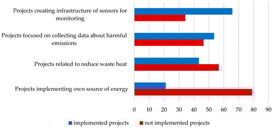 Furthermore, these are projects focused on collecting data about releasing harmful emissions into the air or other resources. The results show that more than 53.5% of companies had implemented these projects. Their goal was to minimize the impact of damage on the environment. Here we can see the connection with the concept of industry 4.0. In this area, projects can also analyze the large volume of data (big data) for effective management and monitoring. Sustainability was associated with a focus on predominantly environmental impacts.