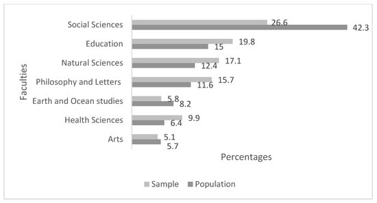 The sample (n = 1187) was a stratified probabilistic analysis [45], with each faculty and facility considered a stratum. The sample size was defined using the calculation for finite [46]: error 3%, 95% confidence, and the expected p value (p = 5%). In addition, we considered representativeness (Figure 1), and obtained data from a total of 51 courses from the seven knowledge areas of UNA.