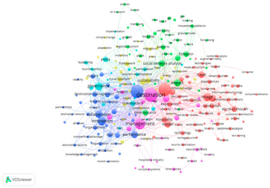 The blue spots and lines denote the first cluster, whose keywords concentrate on innovation and collaboration. The alliance is the main form of this relationship [58,59]. The purpose of the cooperation is achieved through the transformation of knowledge and other resources among companies or organizations [60]. Absorptive capacity, trust, and resources affect the nature of cooperation and the way how the network structure functions. The performance and competitiveness of companies or organizations also emerge as determinant research hotspots. At the same time, Figure 2 shows that the keyword innovation does not only connect the absorptive capacity, collaboration, competitiveness, trust, firms and organization, and so forth, within the cluster but also links the first cluster to other clusters. This shows that innovation has been at the heart of studying tourism destination, development and management, and, in fact, will continue to be vital in future studies too.