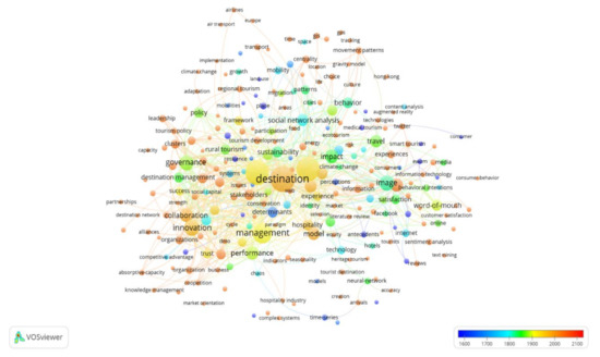 Figure 3 adds a temporal frame to the network of keywords. The figure shows that most of the keywords are yellow and red, which indicates that the tourism destination network research has a good momentum of development as a whole. The more prominent one is cluster 1, concerning innovation and collaboration, which is still a burgeoning research theme. In addition, stakeholders, social media and sustainable development remain to be among the profound research hotspots in the contemporary tourism destination development and management.